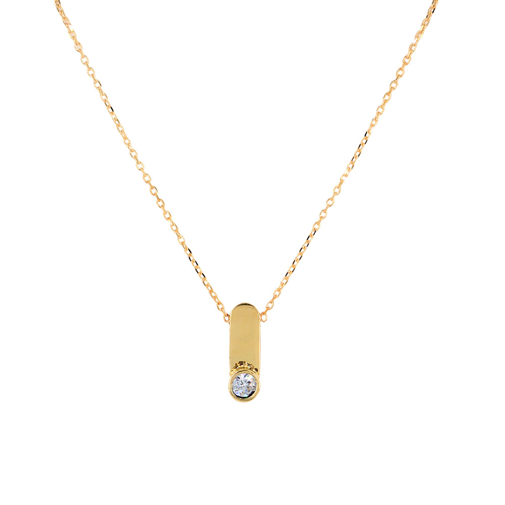 Χρυσό Κολιέ 9 Καρατίων με σχέδιο κάθετη μπάρα με λευκή πέτρα ζιργκόν στην άκρη.