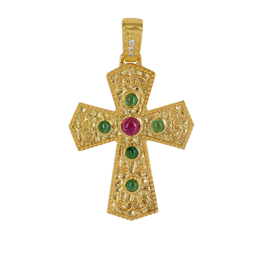 Xρυσός σταυρός 14 Καρατίων, βυζαντινός, με κόκκινη κεντρική πέτρα καθώς και πράσινες πέτρες ζιργκόν.