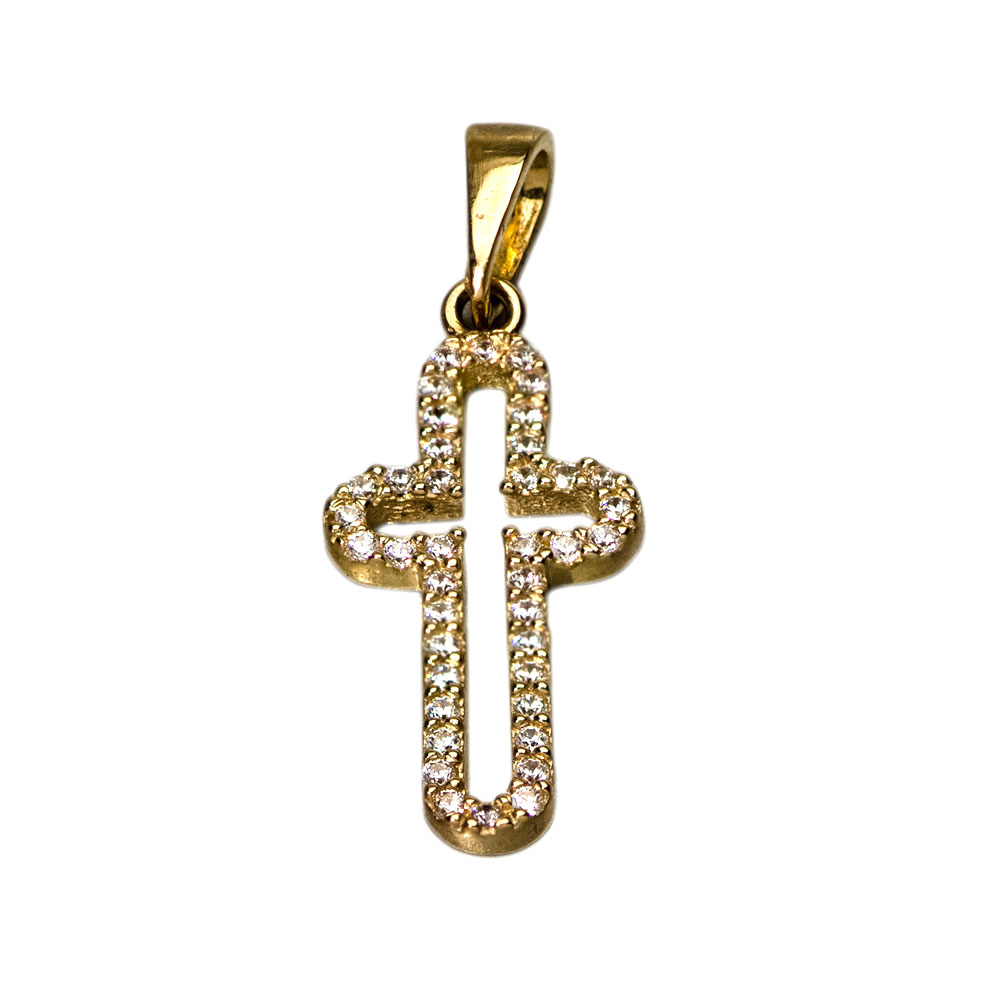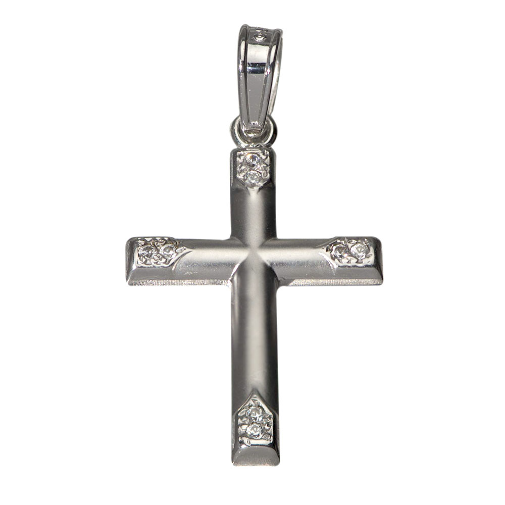 Λευκόχρυσος σταυρός 14 Καρατίων, γυναικείος, με ματ φινίρισμα και λευκές πέτρες ζιργκόν Swarovski στα άκρα του.