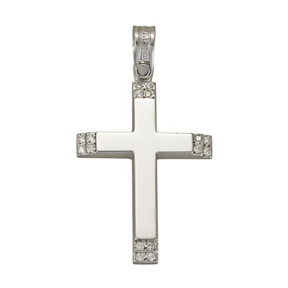 Χρυσός σταυρός 14 Καρατίων, γυναικείος με λουστρέ φινίρισμα και λευκόχρυσα φύλλα με ματ φινίρισμα που αγκαλιάζουν το σταυρό. Το σταυρό στολίζουν λευκές πέτρες ζιργκόν Swarovski.