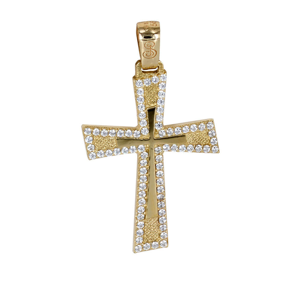 Χρυσός σταυρός 14 Καρατίων, γυναικείος, με λουστρέ φινίρισμα και λευκές πέτρες ζιργκόν