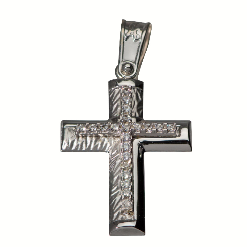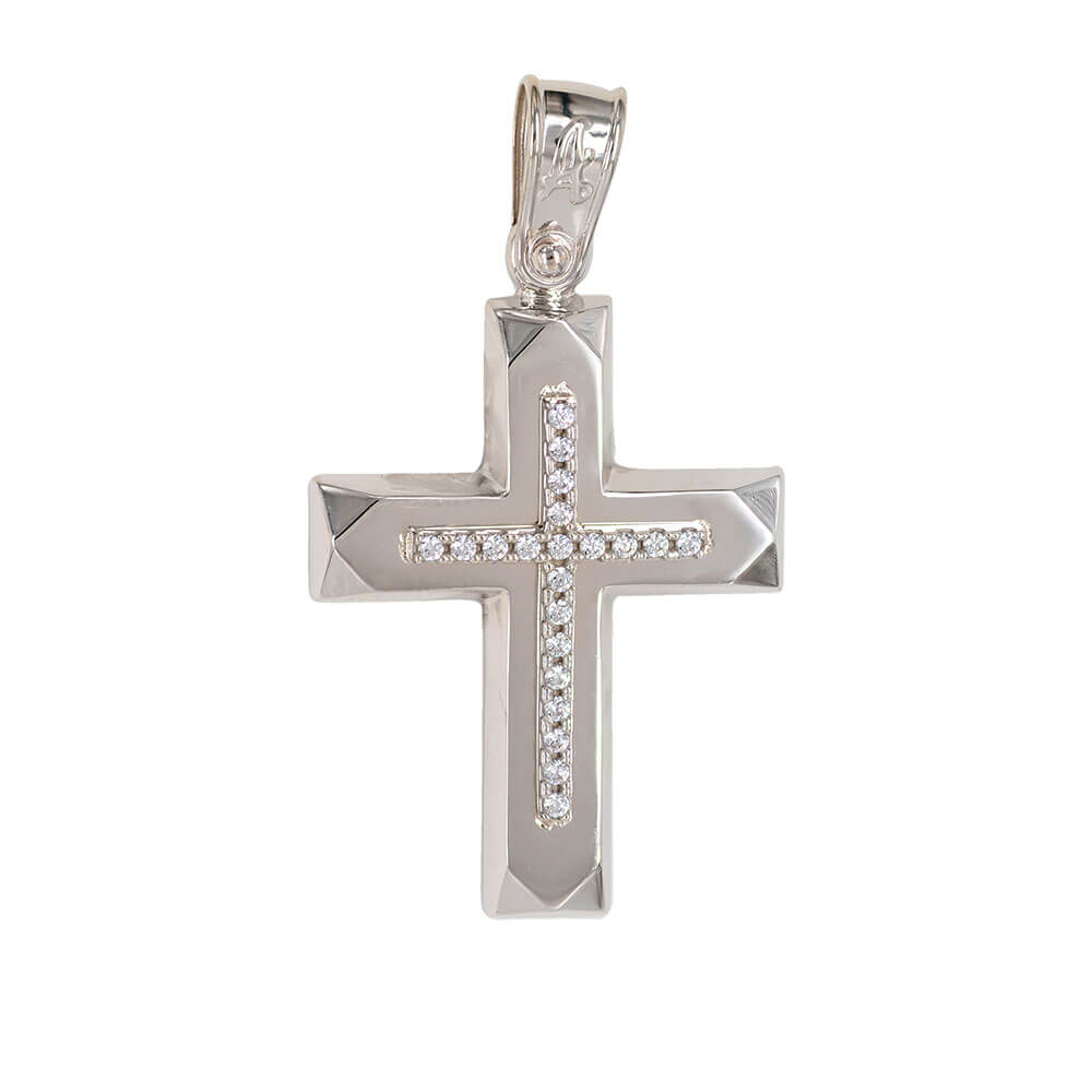 Λευκόχρυσος σταυρός 14 Καρατίων, γυναικείος, λουστρέ με λευκές πέτρες ζιργκόν Swarovski που σχηματίζουν ένα σταυρό στο κέντρο.