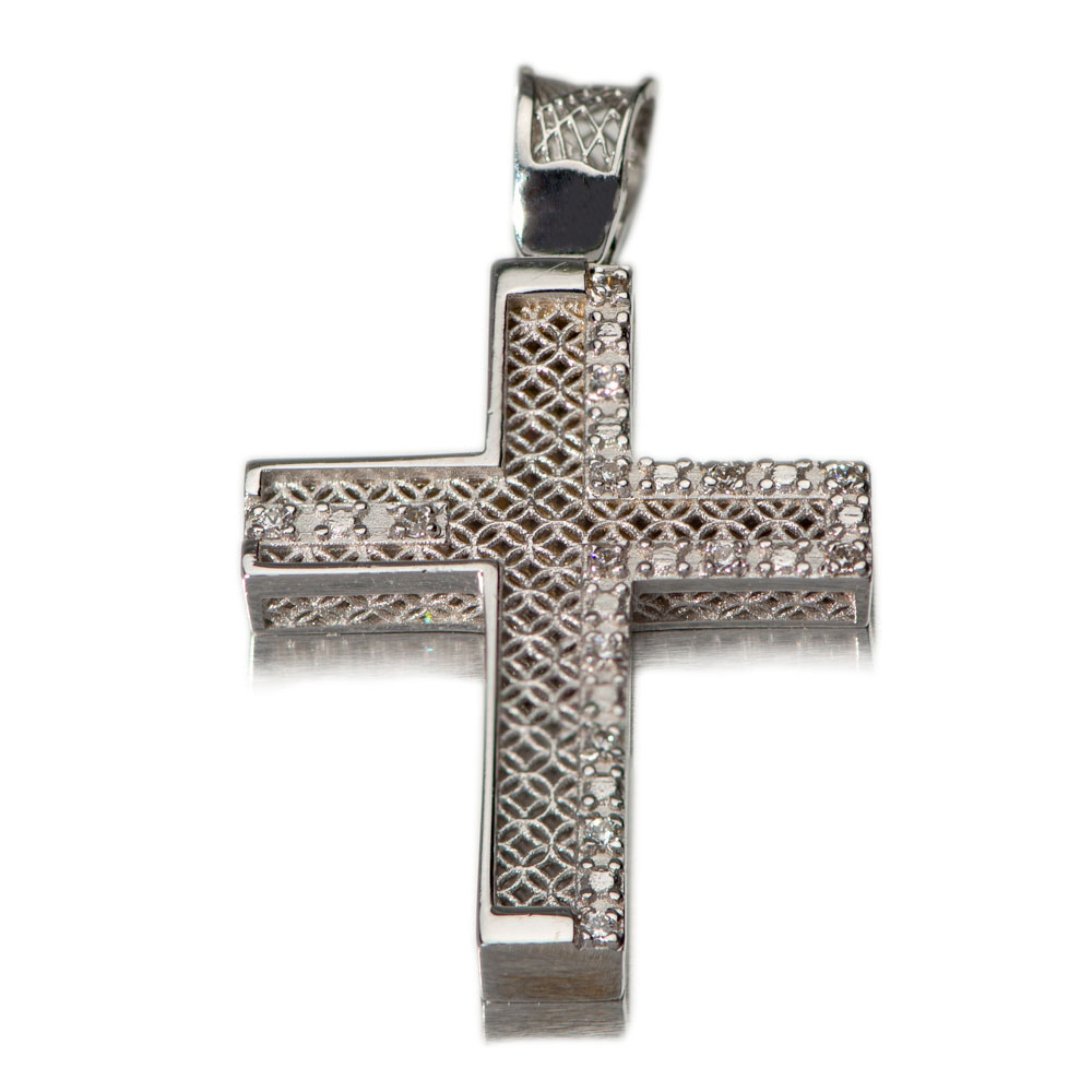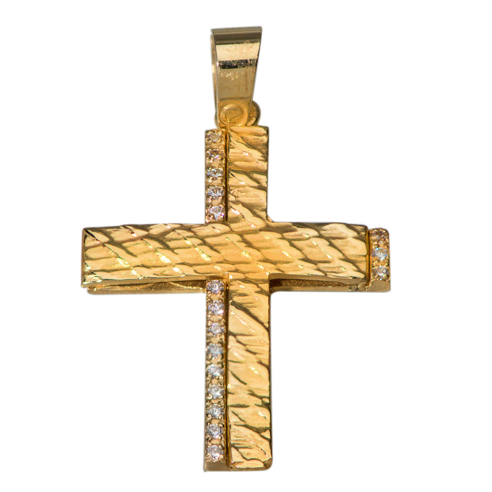 Χρυσός σταυρός 14 Καρατίων, διπλής όψεως, γυναικείος, με σαγρέ φινίρισμα, ανάγλυφα σχέδια και λευκές πέτρες ζιργκόν Swarovski.