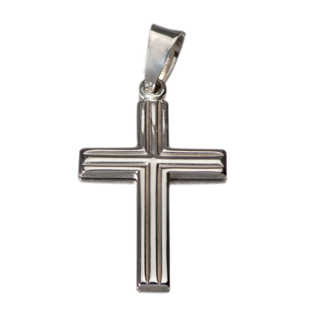 Λευκόχρυσος σταυρός 14 Καρατίων ανδρικός με λουστρέ φινίρισμα και αναγλυφες γραμμές στην επιφάνειά του.
