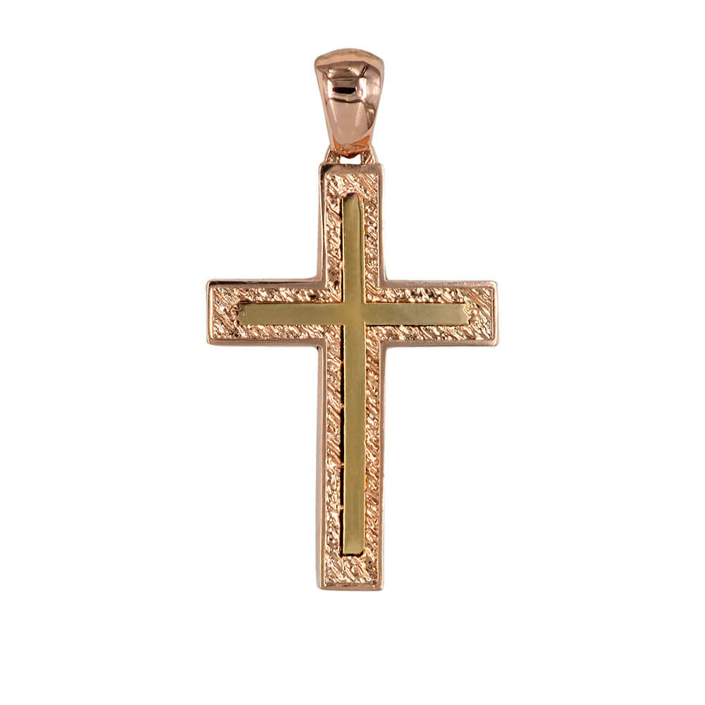 Ροζ Χρυσός Σταυρός 14 Καρατίων, γυναικείος, διπλής όψεως, με λουστρέ φινίρισμα και λευκές πέτρες ζιργκόν Swarovski.