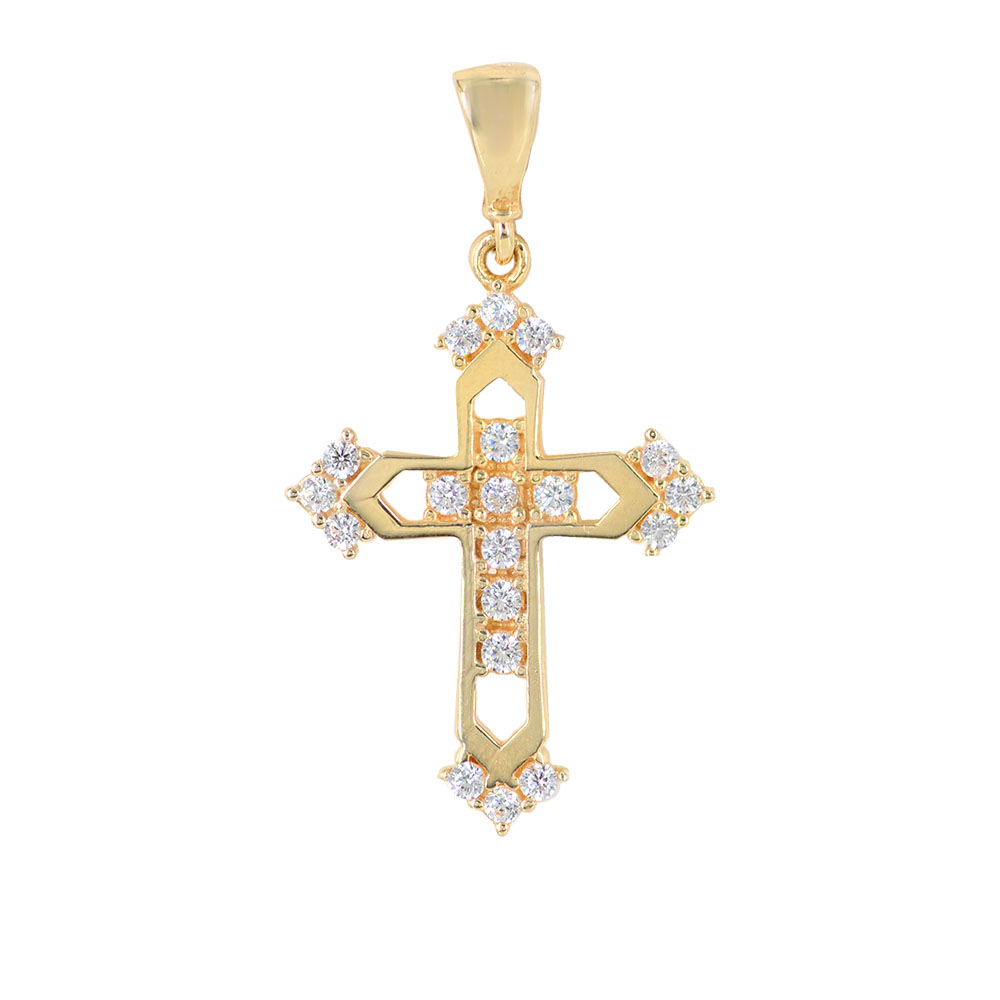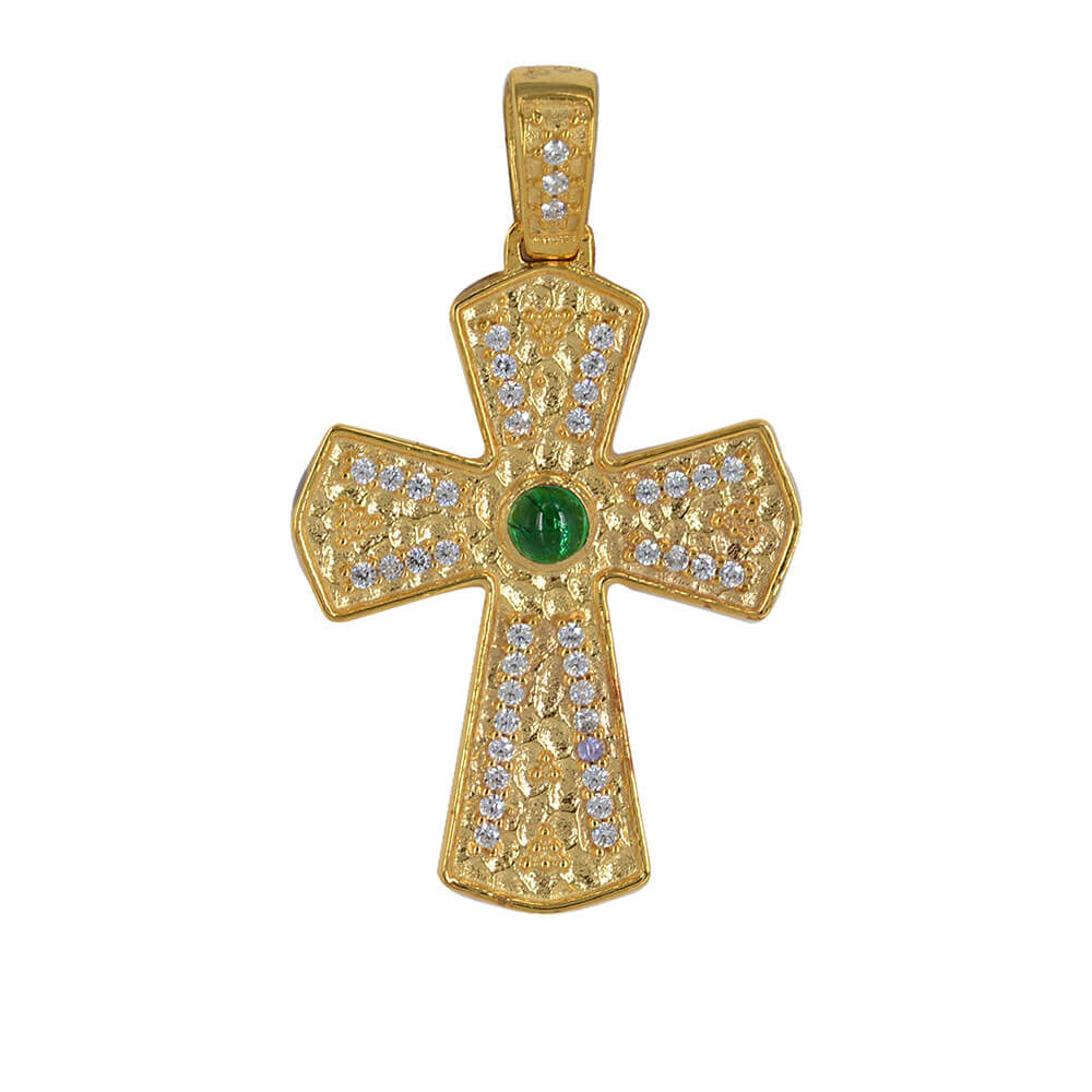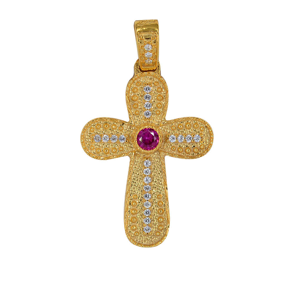 Χρυσός σταυρός 14 Καρατίων, βυζαντινός, με κόκκινη κεντρική πέτρα ζιργκόν καθώς και μικρότερες λευκές πέτρες ζιργκόν.