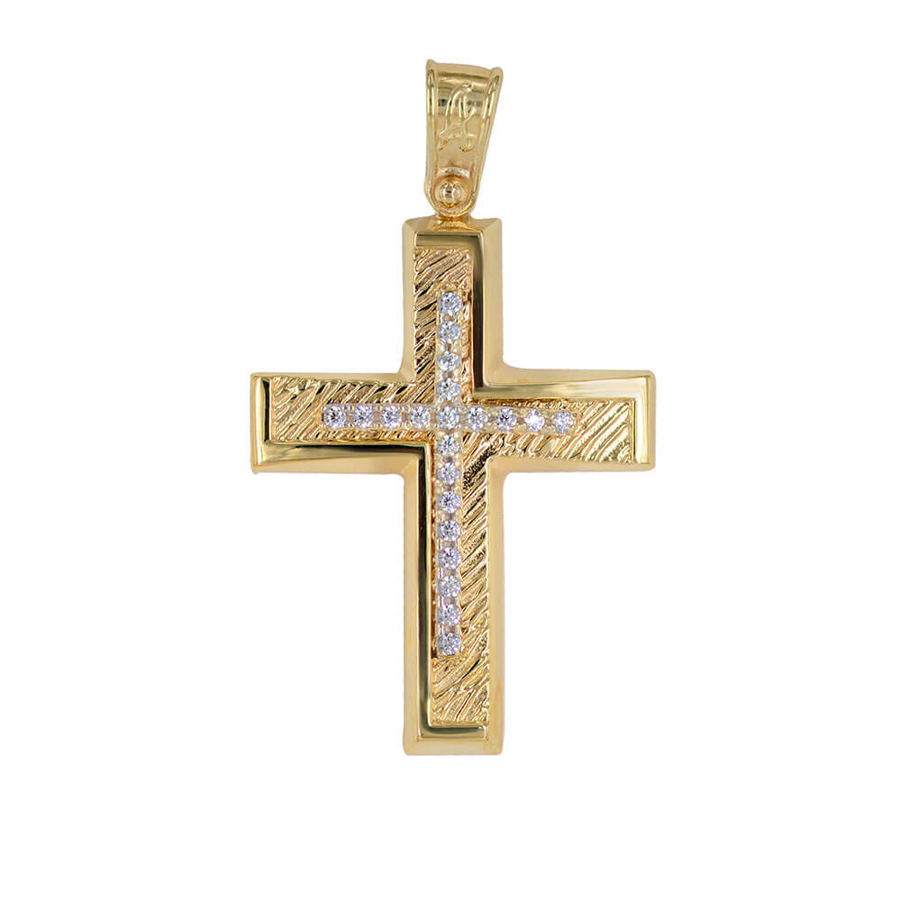 Χρυσός σταυρός 14 Καρατίων, γυναικείος, με λουστρέ φινίρισμα και λευκές πέτρες ζιργκόν που σχηματίζουν τον κεντρικό σταυρο.