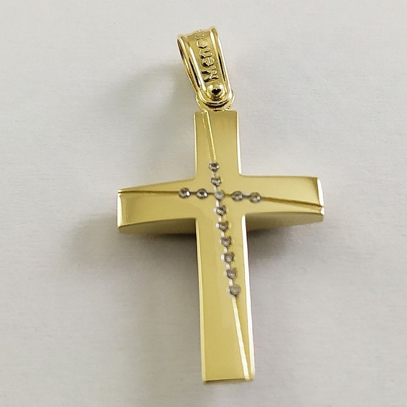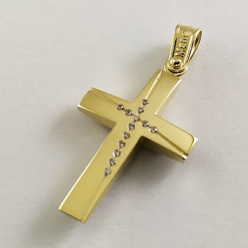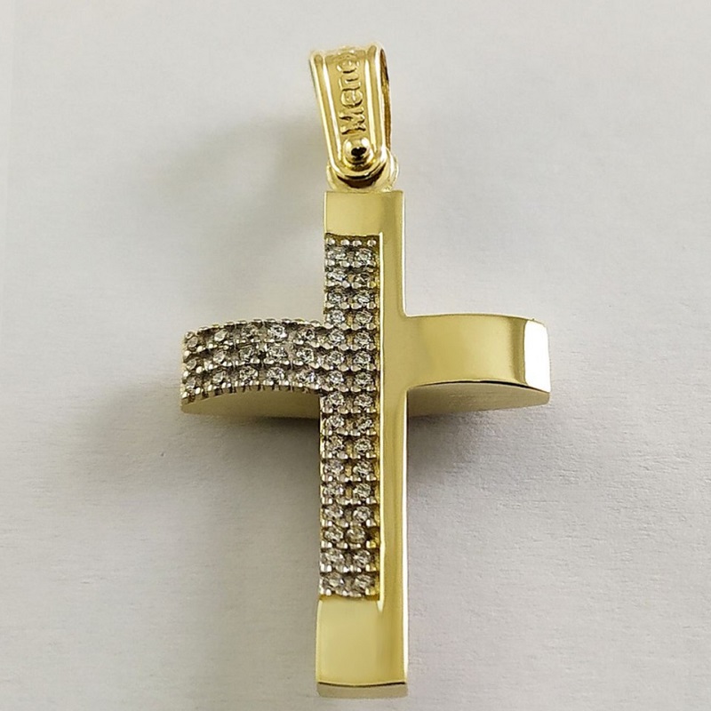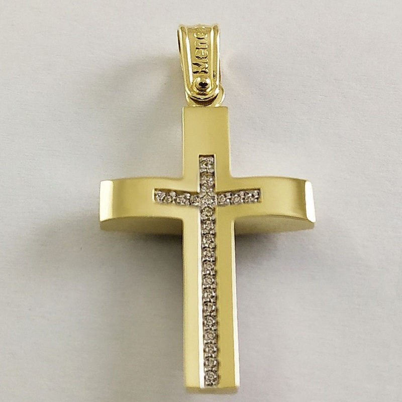 Γυναικείος Σταυρός δημιουργίας "Μενέκου", σε κίτρινο χρυσό 14 καρατίων, minimal γραμμής, με ανάγλυφο σχέδιο σταυρού σ' όλο το μήκος του το οποίο είναι στολισμένο με πέτρες ζιργκόν στο κεντρικό τμήμα του. Γυαλιστερή, σατινέ και ματ υφή.