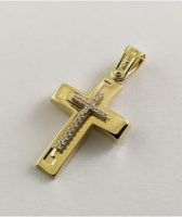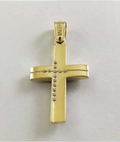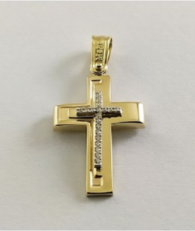 Χρυσός σταυρός 14 Καρατίων, με λευκές πέτρες ζιργκόν και λουστρέ φινίρισμα.