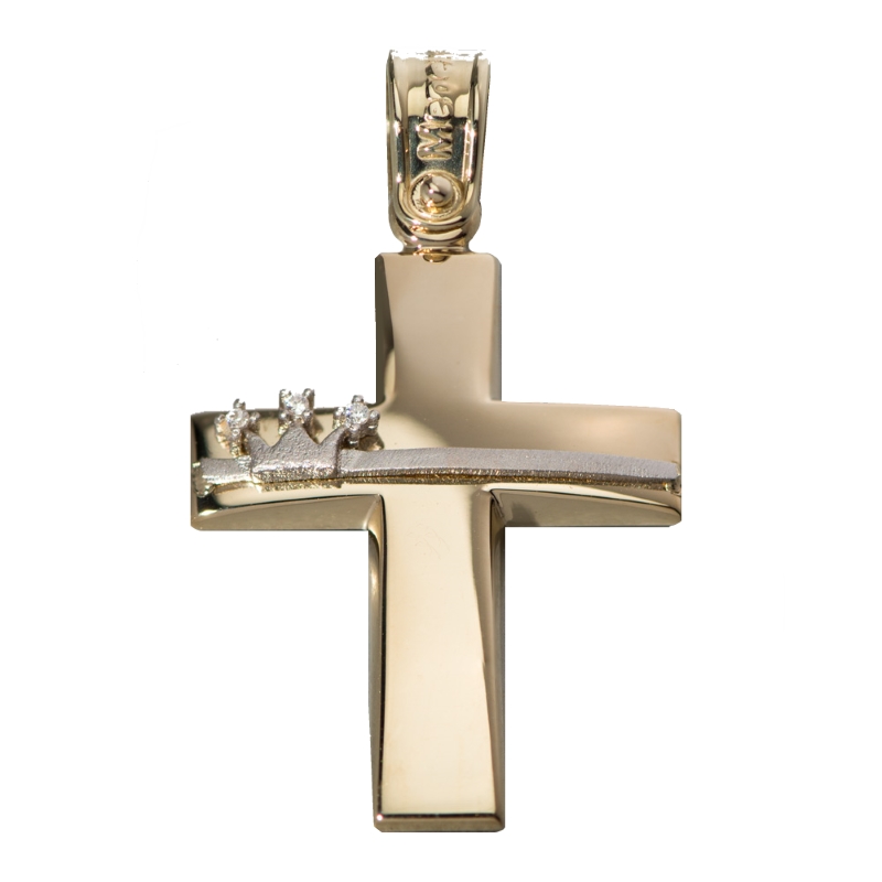 Χρυσός σταυρός 14 Καρατίων, γυναικείος, με λουστρέ φινίρισμα. H οριζόντια πλευρά του σταυρού διακοσμείται με μία λευκόχρυση γραμμή, η οποία καταλήγει σε μια λευκόχρυση κορώνα με τρεις λευκές πέτρες ζιργκόν Swarovski.