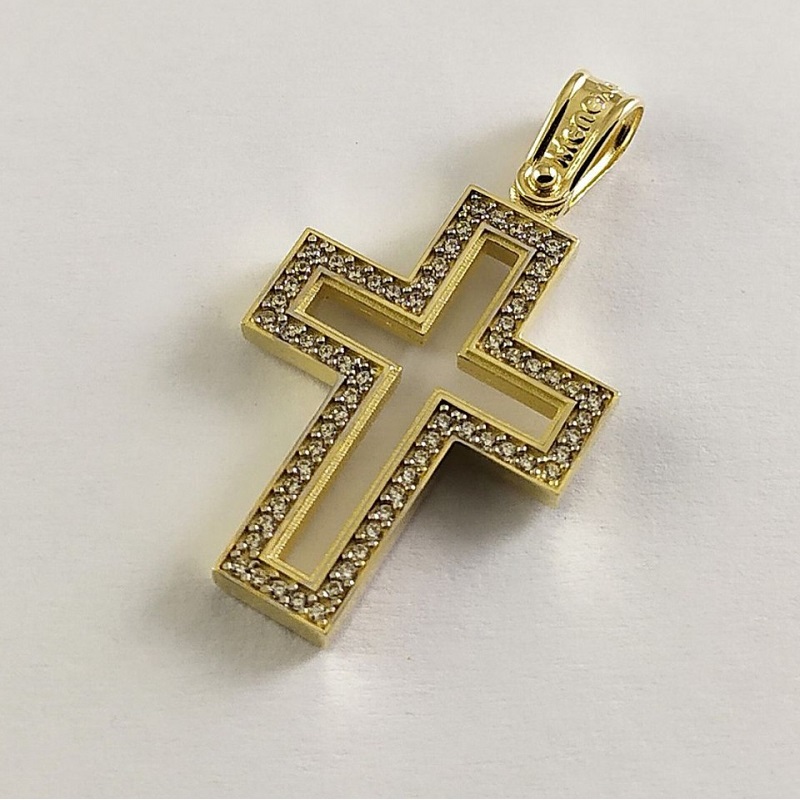 Γυναικείος Σταυρός δημιουργίας "Μενέκου", σε κίτρινο χρυσό 14 καρατίων, minimal γραμμής, με πέτρες ζιργκόν περιμετρικά του σταυρού. Γυαλιστερή, σατινέ και ματ υφή.