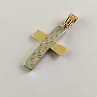 Γυναικείος Σταυρός δημιουργίας "Μενέκου", δίχρωμος σε κίτρινο χρυσό 14 καρατίων, με καμπύλες γραμμές και πέτρες ζιργκόν στο κάθετο τμήμα του. Γυαλιστερή, σατινέ και ματ υφή.
