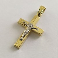 Ανδρικός Σταυρός δημιουργίας "Μενέκου", σε κίτρινο χρυσό 14 καρατίων, minimal γραμμής. Σατινέ, ματ υφή και σαγρέ με ανάγλυφο σχέδιο και ένθετο λευκόχρυσο εσταυρωμένο.