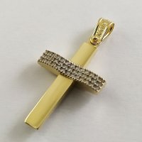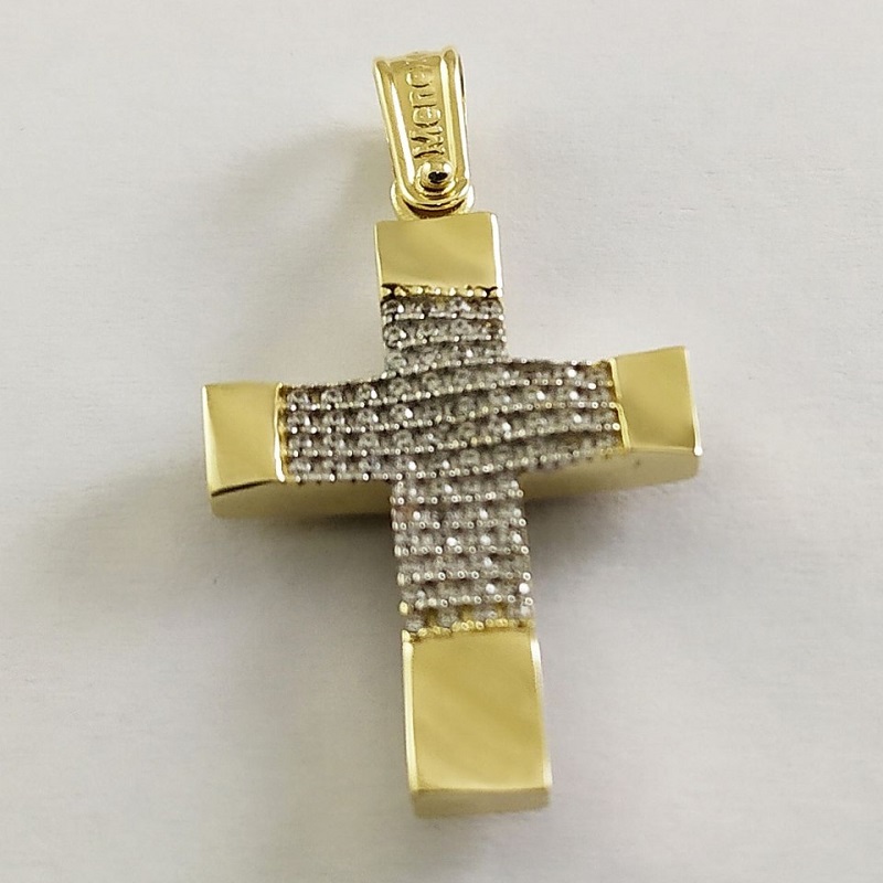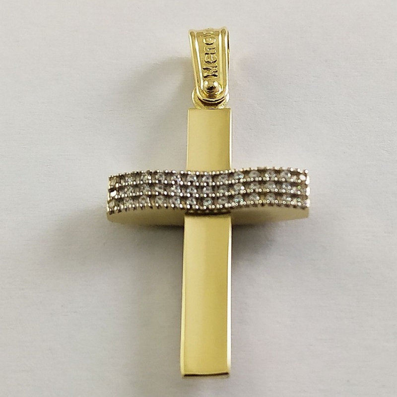 Γυναικείος Σταυρός δημιουργίας "Μενέκου", σε κίτρινο χρυσό 14 καρατίων, με καμπυλωτές γραμμές. Το οριζόντιο τμήμα του, είναι στολισμένο με πέτρες ζιργκόν σε όλο το μήκος του. Γυαλιστερή, σατινέ και ματ υφή.