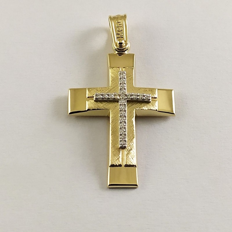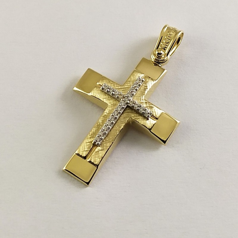 Γυναικείος Σταυρός δημιουργίας "Μενέκου", σε κίτρινο χρυσό 14 καρατίων, minimal γραμμής με ανάγλυφο σαγρέ σχέδιο σταυρού, γυαλιστερές άκρες και ένθετο σταυρό από πέτρες ζιργκόν.
