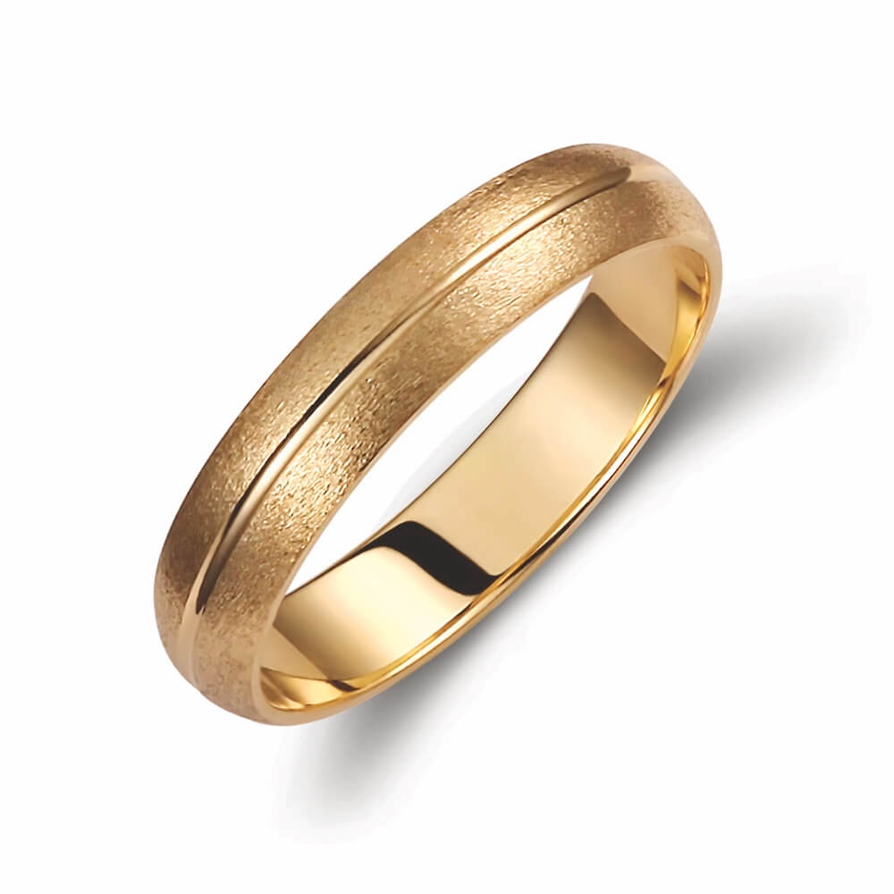 Χρυσή βέρα γάμου και αρραβώνα Valauro 8 καρατίων και πλάτος 4.5mm, κίτρινη σαγρέ σε διαχρονική γραμμή.