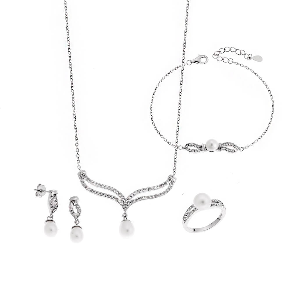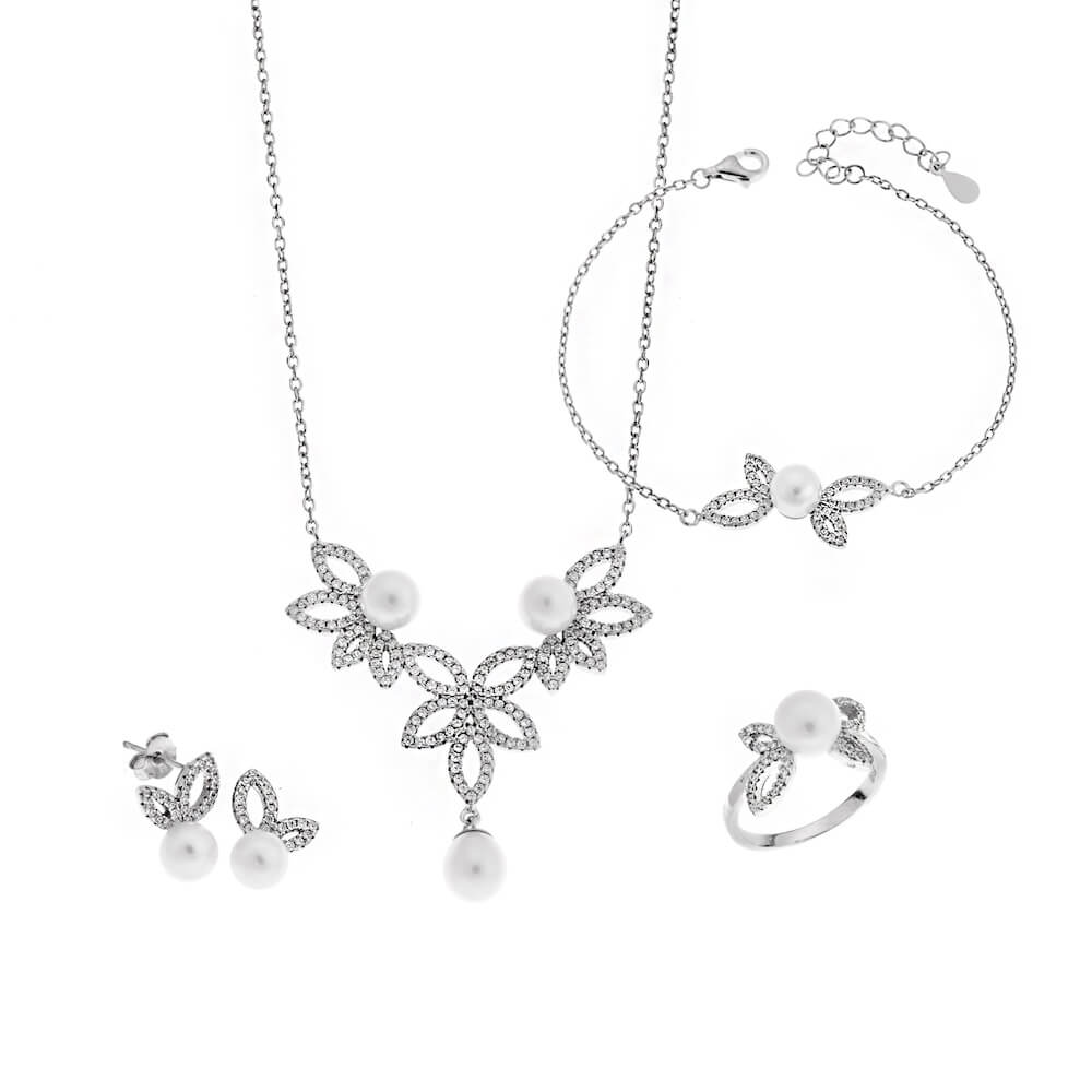 Σετ Ασημένιο 925°,  με περίτεχνο σχέδιο απο ζιργκόν και πέρλες, που σχηματίζουν λουλούδια.