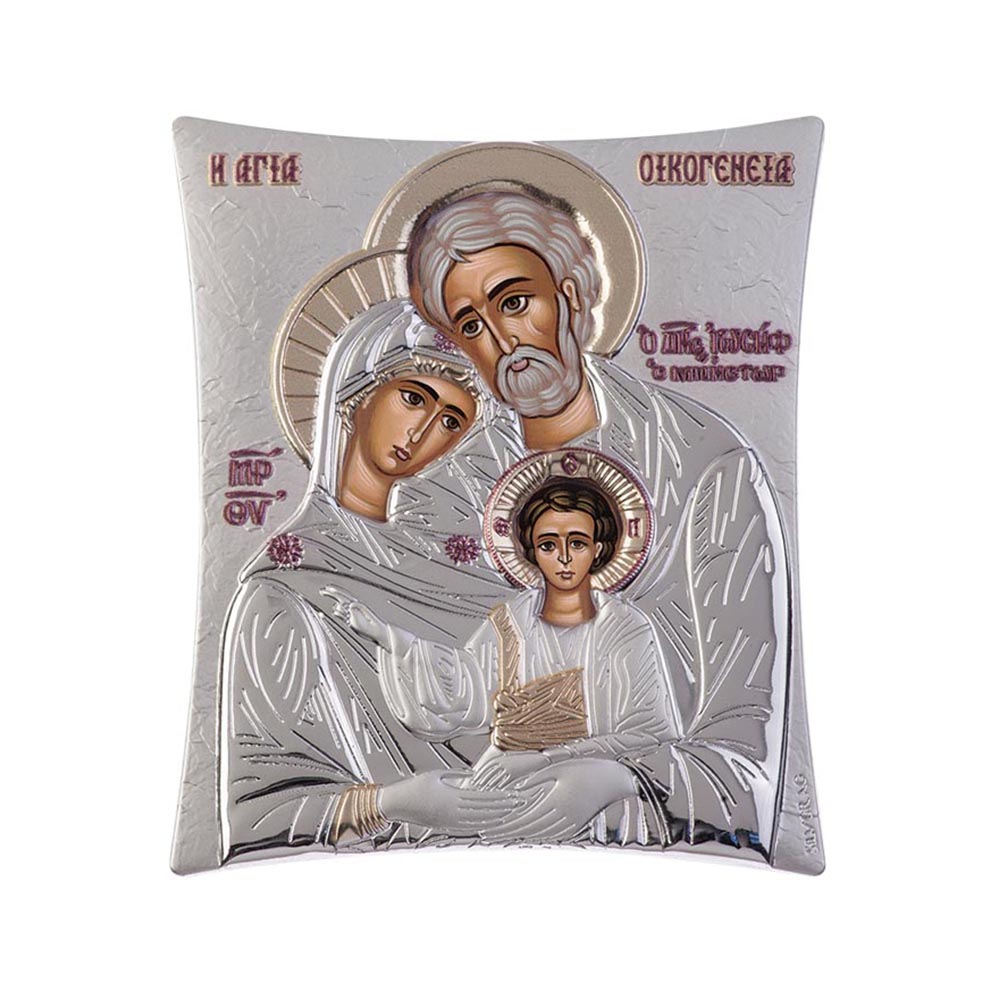 Ασημένια εκκλησιαστική εικόνα, ασύμμετρη, που απεικονίζει την Αγία Οικογένεια.