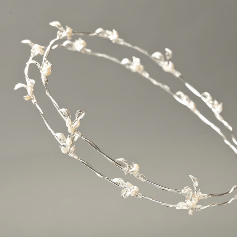 Ασημένια στέφανα γάμου με φύλλα ελιάς στο μπροστινό μέρος.