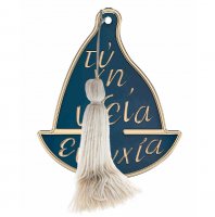 Γούρι επιτραπέζιο σε σχέδιο καράβι και λευκή πλάτη από ξύλο. Αναγράφονται πάνω οι ευχές "Τύχη , Υγεία , Ευτυχία".  Δεν υπάρχουν πιο ωραίες ευχές για να στολίζουν το σπίτι σας ή το σπίτι των αγαπημένων σας προσώπων.