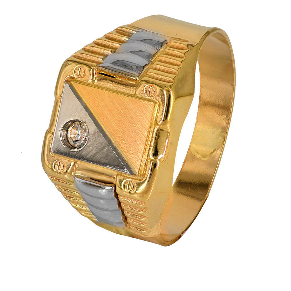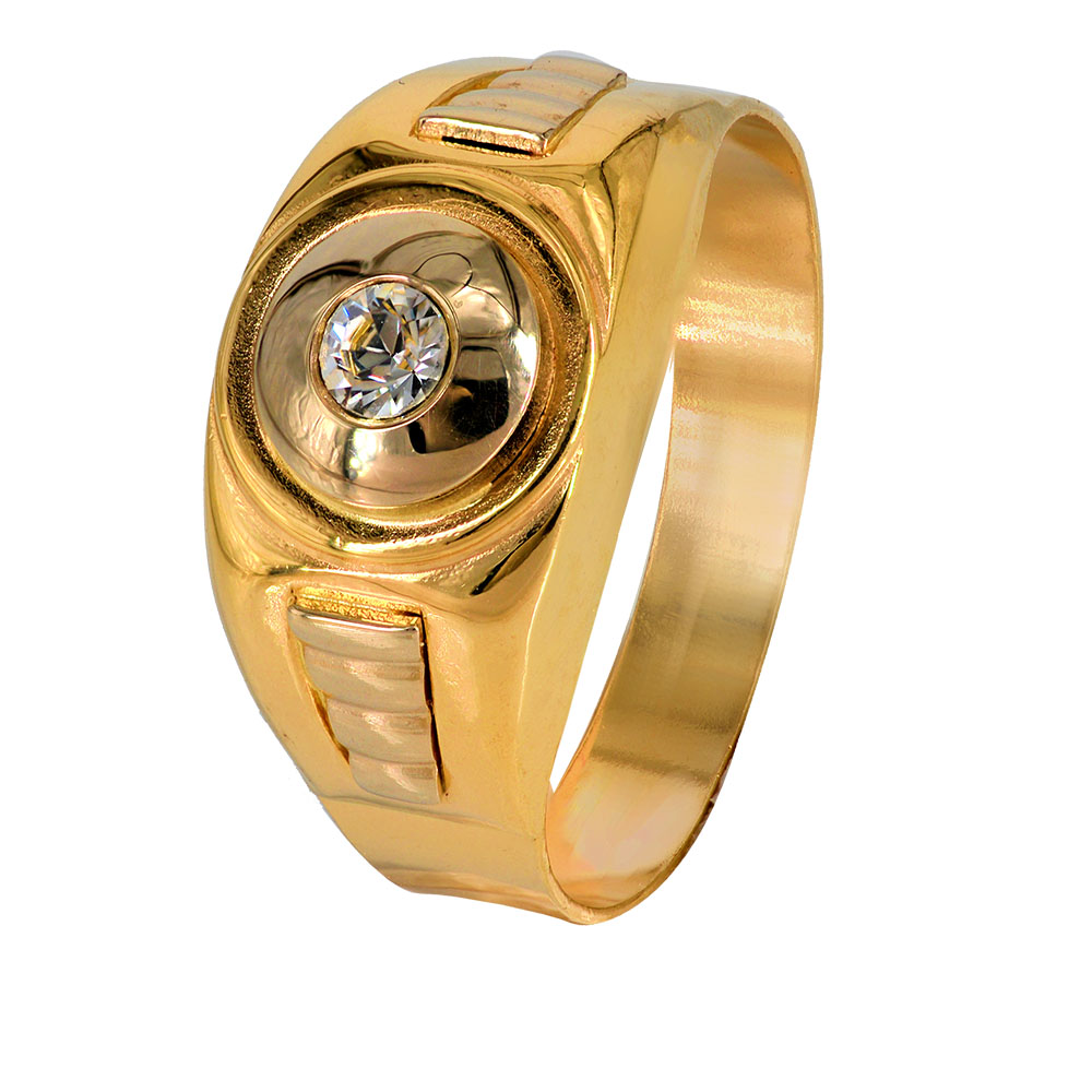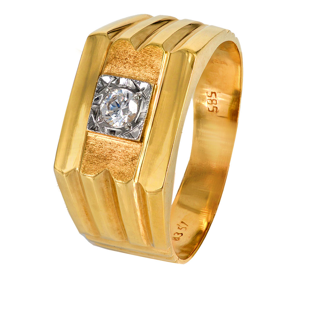Χρυσό ανδρικό δαχτυλίδι 14 Καρατίων με ανάγλυφα σχέδια και λευκή πέτρα ζιργκόν.