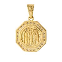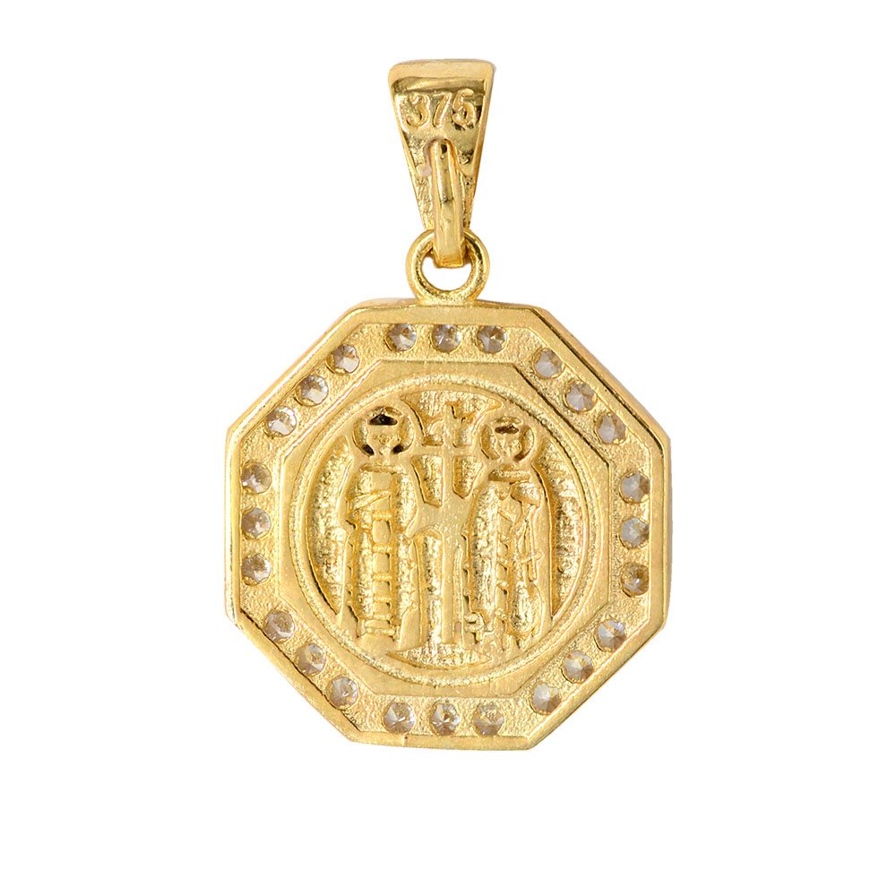 Μενταγιόν Χρυσό 9 Καρατίων πολύγωνο, διπλής όψεως, με ανάγλυφες μορφές του Αγίου Κωνσταντίνου και της Αγίας Ελένης στη μία του όψη και Ιησούς Χριστός Νικά στην άλλη. Διαθέτει λευκές πέτρες ζιργκόν στο περίγραμμα.