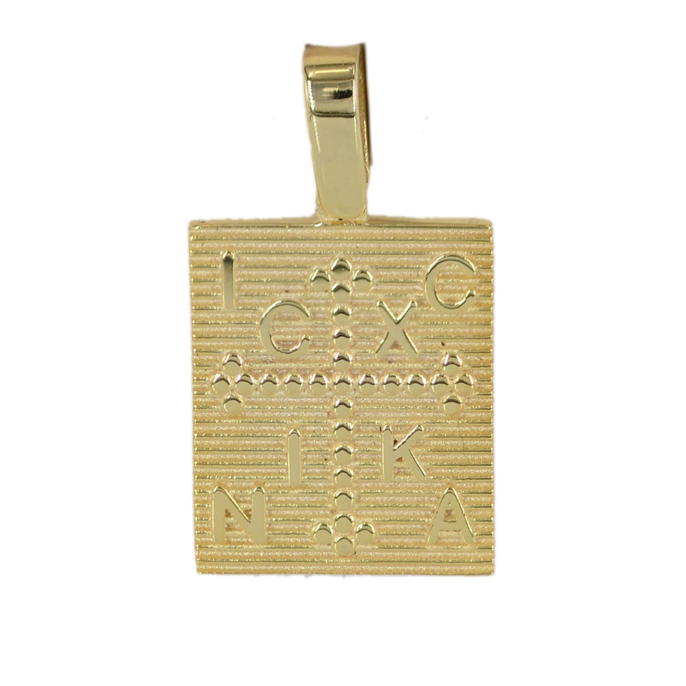 Μενταγιόν Χρυσό 9 Καρατίων ορθογώνιο, διπλής όψεως, με ανάγλυφες μορφές του Αγίου Κωνσταντίνου και της Αγίας Ελένης στη μία του όψη και Ιησούς Χριστός Νικά στην άλλη.