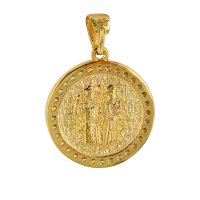 Μενταγιόν Χρυσό 9 Καρατίων, διπλής όψεως, με ανάγλυφες μορφές του Αγίου Κωνσταντίνου και της Αγίας Ελένης στη μία του όψη και Ιησούς Χριστός Νικά στην άλλη. Διαθέτει λευκές πέτρες ζιργκόν στο περίγραμμα.