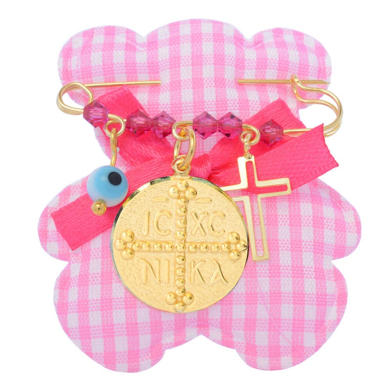 Ασημένια επιχρυσωμένη παραμάνα για κοριτσάκι, από ασήμι 925°, με ροζ χάντρες, σταυρό, Κωνσταντινάτο και ματάκι