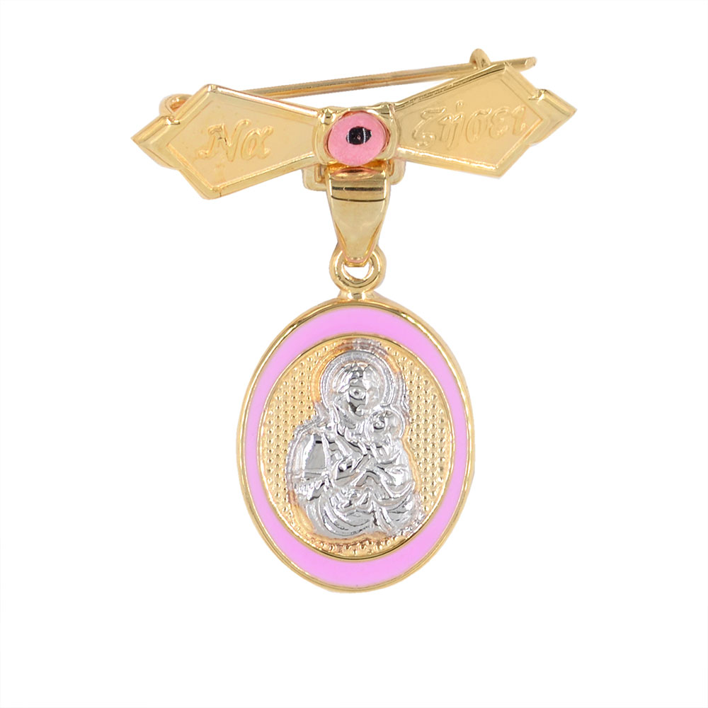 Δίχρωμη Χρυσή και Λευκόχρυση παραμάνα 9 Καρατίων Παναγία και Χριστός με ροζ και λευκό σμάλτο σε σχήμα καρδιάς, για κοριτσάκι