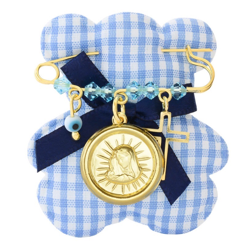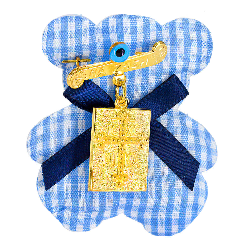Ασημένια επιχρυσωμένη παραμάνα για αγοράκι, από ασήμι 925°, με μπλε χάντρες, σταυρό, Κωνσταντινάτο και ματάκι.