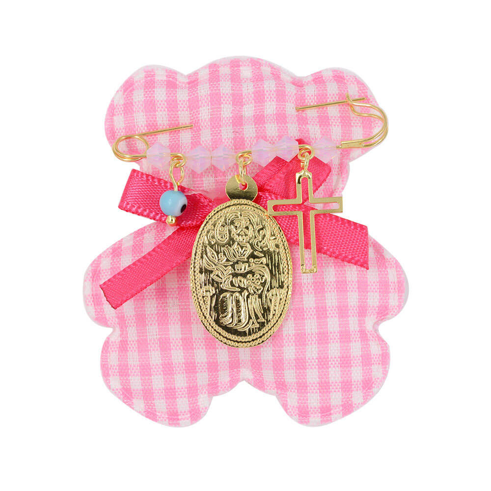 Ασημένια επιχρυσωμένη παραμάνα για κοριτσάκι, από ασήμι 925°, με ροζ χάντρες, σταυρό, Κωνσταντινάτο και ματάκι.