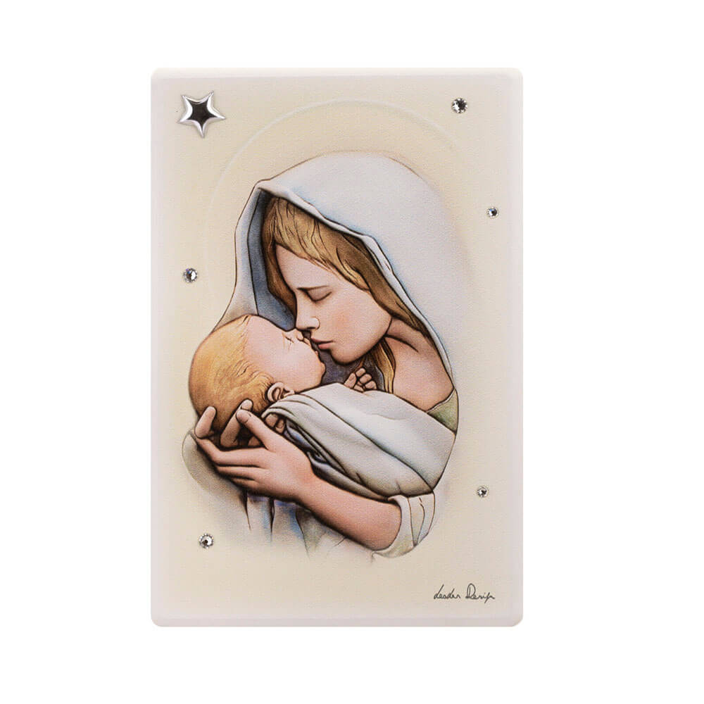 Υπέροχη απεικόνιση της Παναγίας και του Χριστού πάνω σε ξύλο με τη μέθοδο της νωπογραφίας ή αλλιώς ''Fresco''.Τα χρώματα, τοποθετούνται επάνω στο κονίαμα του ξύλου, όσο είναι ακόμα νωπό. Με διακριτικές λεπτομέριες απο ασήμι και Swarovski. Είναι μια ιδιαίτερη και μοντέρνα επιλογή δώρου για τα αγαπημένα σας πρόσωπα.