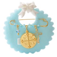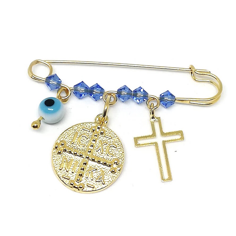 Ασημένια επιχρυσωμένη παραμάνα για αγοράκι, από ασήμι 925°, με μπλε χάντρες, σταυρό, Κωνσταντινάτο και ματάκι.